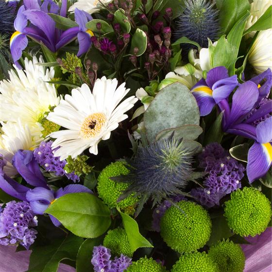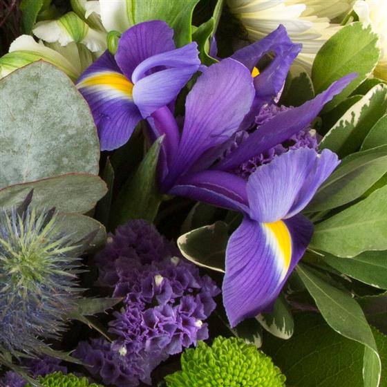 Vibrant limes and purples create a zesty combination of flowers and foliage including alstromeria, carnations, thistles and chrysanthemums.