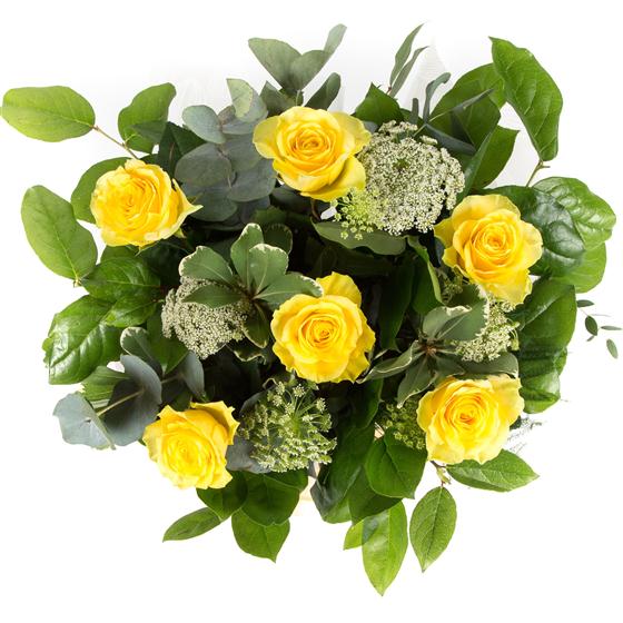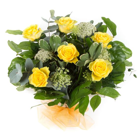 A hand-tied bouquet of long stemmed golden yellow roses complemented with varigated foliage presented in water.